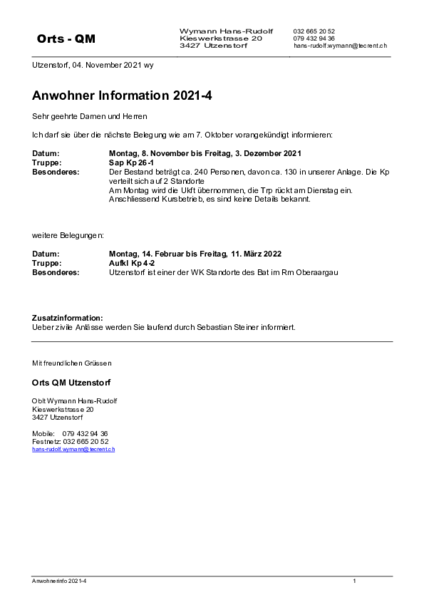 Militär in Utzenstorf08.11.2021 - 03.12.2021 sowie 14.02.2022 - 11.03.2022Anwohnerinfo 04-2021 Zurück zur Übersicht